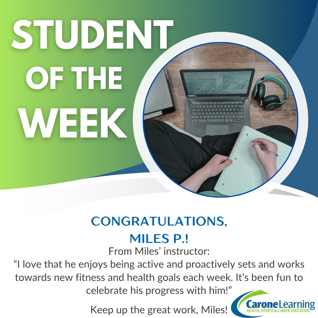 This is the second course I’ve been privileged to have Miles a part of. He consistently strives to do his best, whether in his coursework or in his workouts. He is a competitive athlete with an intense schedule and time is tight, which makes it all the more impressive that he makes sure to communicate with me regularly when he has delays or questions. He does a great job staying on pace and submitting quality coursework. I love that he enjoys being active and proactively sets and works towards new fitness and health goals each week. It’s been fun to celebrate his progress and wins with him and I look forward to seeing how much more he can achieve.